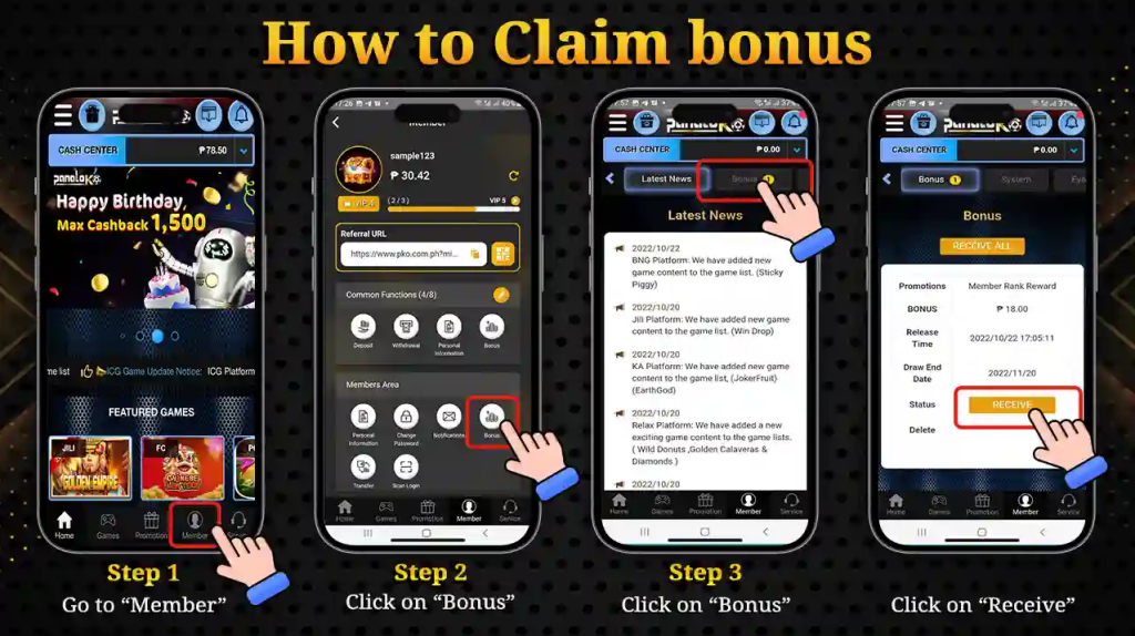 4.How to receive Reward: Member Center > Notification > Bonus > click to receive